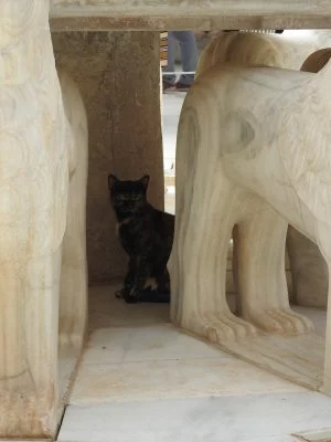 No es el único que se encuentra en la plaza, cerca de la puerta de la Alcazaba, otros dos gatos sentados como unas efigies y con los ojos cerrados llaman mi atención. Parece que meditan; uno de ellos abre un poco los ojos y me mira. Otra vez siento que soy yo la que está de prestado en ese lugar. Sonrío y camino hacia los palacios Nazaríes.